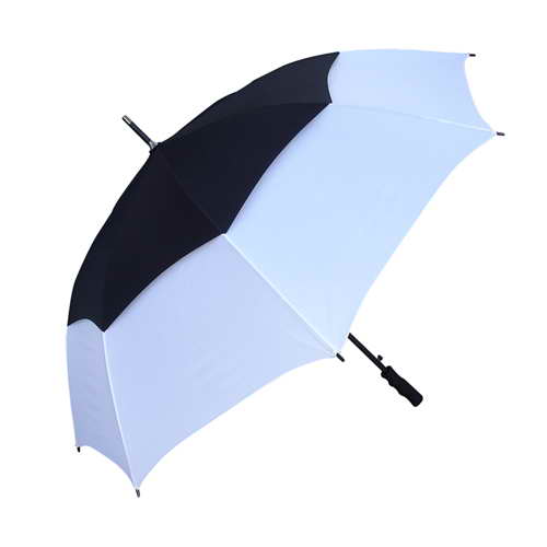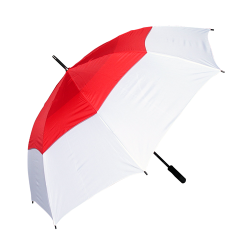 High quality automatic opening wind golf umbrella, it has a vented twin-panel showerproof and windproof eight-panel 190T pongee canopy with two Velcro ties, strong fibre glass shaft with a metal tip, black moulded soft-touch rubber handle and 75cm ribs.